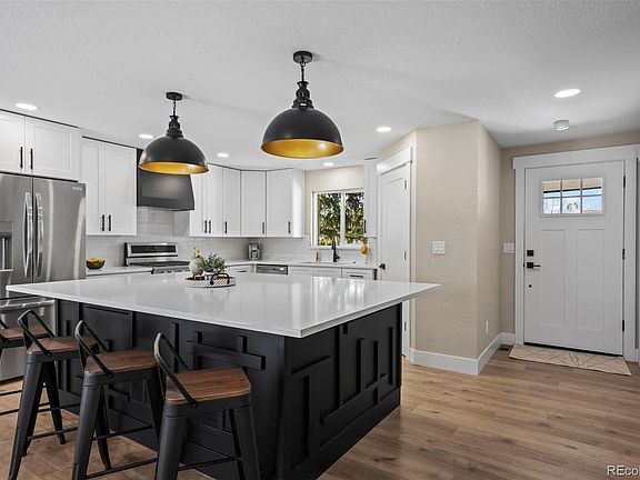 Welcome to your beautifully renovated haven in Arvada, where modern elegance meets thoughtful design. Upon entry, you're welcomed by the warmth of new LVP flooring, guiding you through spaces illuminated by natural light streaming through newly installed windows. The ambiance is set with fresh paint and chic light fixtures, creating a peaceful yet contemporary vibe. The kitchen, reimagined as the centerpiece of this home, dazzles with a gas stove and a suite of brand-new appliances, ensuring culinary excellence. A stylish quartz peninsula not only houses a built-in microwave and beverage fridge but also stands as a design highlight with its modern wall decor and custom hood. The walk-in pantry is a dream for any home chef, offering ample storage for all your needs. Outside, an expansive wraparound deck invites you for summer barbecues or serene coffee mornings. Inside, the layout features three upstairs bedrooms, including a luxurious master with an en-suite bathroom and a spacious walk-in closet.
