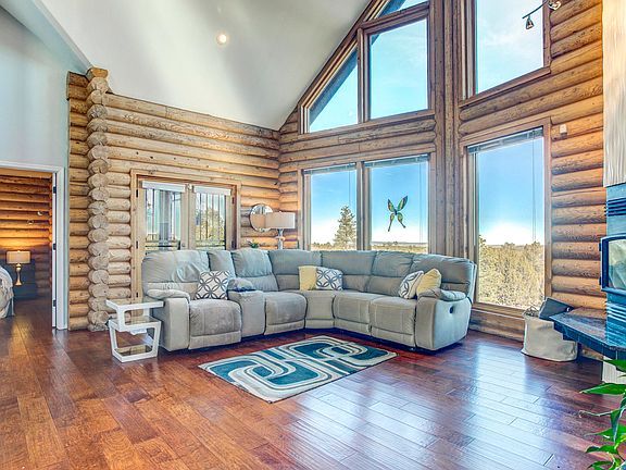 BORDERS NATIONAL FOREST! MOUNTAIN VIEWS! MAJESTIC FULL LOG CABIN ON 5 GORGEOUS ACRES IN THE TREES. 3 BEDRM, 2 BATH, OPEN FLR PLAN, 2255 SQ FT & REAL WOOD RADIANT HEATED FLOORS. THE GREAT RM W/COZY WOOD FP, BIG BRIGHT WINDOWS, & VAULTED CEILING. FABULOUS KITCHEN W/ PEARL BLACK GRANITE, STAINLESS STEEL APPLS, CUSTOM BACK SPLASH, & ISLAND. SEP DIN W/CIRCULAR WINDOWS FROM CEILING TO FLOOR. HUGE MASTER SUITE W/ SEE THROUGH FP MAKING THE MASTER BTH AREA DELIGHTFUL. DBL SINKS W/ TILE BACKSPLASH & SEP BATH. NICE SIZE HOBBY RM OFF THE MASTER W/ IT'S OWN WD STOVE, BALCONY, & SEP ENTRANCE. SPACIOUS GUEST BEDRMS. LG GUEST BATHRM W/ SPECIAL ''INTELLIGENCE SHOWER'' BLENDING AROMETHERPY & STEAM. OPEN THE EXTERIOR FRENCH DOORS TO THE ROOMY DECK W/ BUILT IN HOT TUB/GAZEBO AREA OR LOUNGE BY THE FIRE PIT