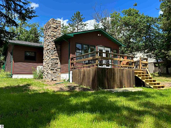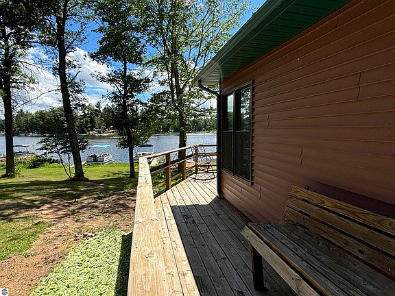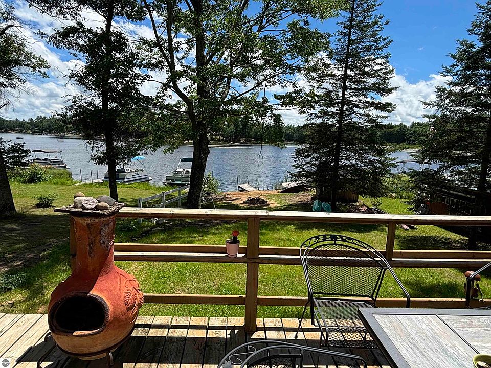 Opportunities like this don't come along very often! This 2 bedroom, 2 bathroom house has a fantastic view of Chain Lake, with 50' of water frontage. Whether you're sitting in the living room, or on the deck you can take in the views of the lake. You will find an open floor plan offering lots natural light, and lot of of elbow room. You will also find a skylight in the 1/2 bath and the entry way. The house has been nicely updated throughout the years, with a new septic system installed in 2023, with a new roof and updated electrical in 2012. In 2014 Anderson windows were installed. There is also a Generac Generator, and a Mitsubishi heating/air conditioning unit. Laminate flooring is throughout the house. The attached 2 car garage, can also be heated by the wood stove. Come and take advantage of our beautiful forestry, and hiking/bike tails, and enjoy the area attractions northern Michigan offers.