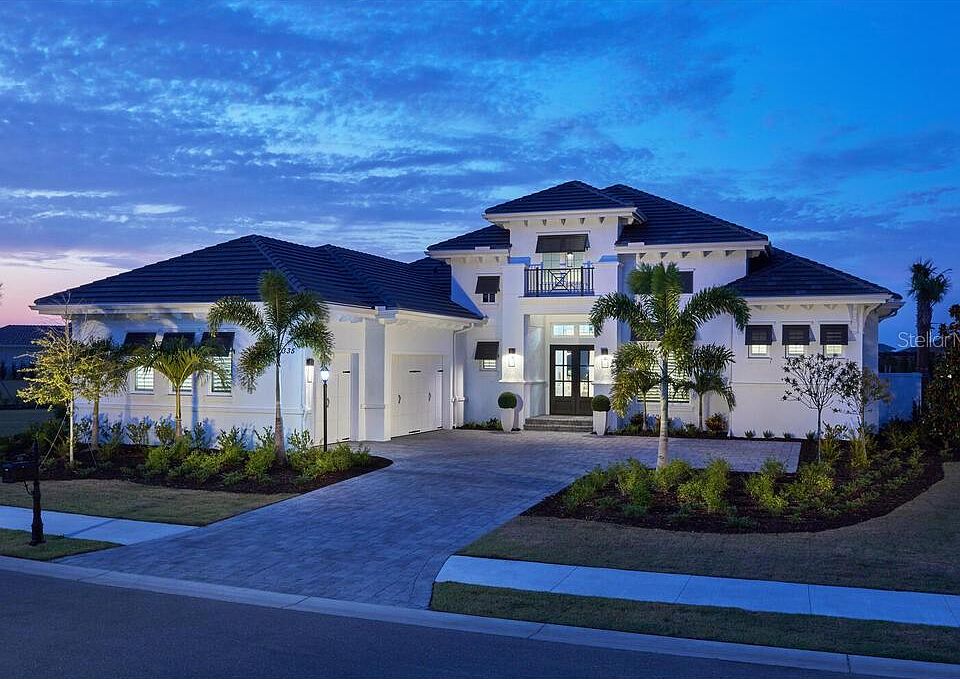 Classic and timeless, this fully furnished custom-designed home showcases refined appointments, fixtures and furnishings and sophisticated, livable indoor-outdoor living spaces with a big water view in the highly sought-after Lake View Estates neighborhood of The Lake Club. Built in 2021, the one-level residence encompasses 4,000 SF plus a 1,000-SF foot screened lakefront lanai that is ideal for family get-togethers and entertaining. A long paver driveway welcomes visitors to the residence, which makes a dramatic statement with double front doors and black window awnings. The home, which is being offered fully furnished, includes a spacious bright, open-concept floorplan with an expansive living room, dining room and kitchen, along with four bedrooms with en-suite bathrooms and walk-in closets, a powder bath, study, bonus room and three-car garage. A soaring entry with a striking chandelier opens to the elegant living room, where disappearing sliding glass doors seamlessly transition to the lanai. The living room’s wow factors include motorized blinds on all slider doors, a stunning 13-foot ceiling with driftwood-like panels and a 28-foot wall with Arabesque moldings. The spectacular gourmet kitchen features a trio of Presidio pendant lights, white quartz countertops, an island with beautiful leather stools, Glazzio tile backsplash, white Shaker cabinetry and Jenn-Air stainless-steel appliances. There also is a large separate walk-in pantry with custom shelves. 24”x 24” ceramic tile flows throughout the main living areas, study and bathrooms, with beautiful carpeting in all four bedrooms and the bonus room. The dining area boasts an exquisite chandelier with hand-forged white iron branches and a solid-wood table stained with an oyster finish. Walls of disappearing sliding glass doors open to allow the extendable dining room table to adjoin the outdoor dining table and accommodate large dinner gatherings. The well-appointed outdoor living space features 12” x 24” porcelain tile flooring, a covered entertainment area with a fireplace and abundant seating, outdoor kitchen with counter seating, raised heated pool and spa, and sun loungers for soaking in the picturesque waterfront landscape. A private retreat awaits in the lovely owner’s suite, which has windows with plantation shutters and custom draperies and a sumptuous bathroom with marble-look ceramic tile, white quartz counters, dual vanities with white Shaker cabinets, oversized walk-in shower with viewing windows and a freestanding tub. Notable features throughout the home include solid-core interior doors and plantation shutters. The home is conveniently located near the western entrance of The Lake Club, which offers a plethora of amenities, including a grand clubhouse, restaurant, fitness center, two pools, tennis, pickleball and playground.