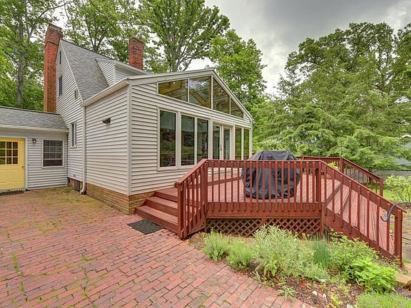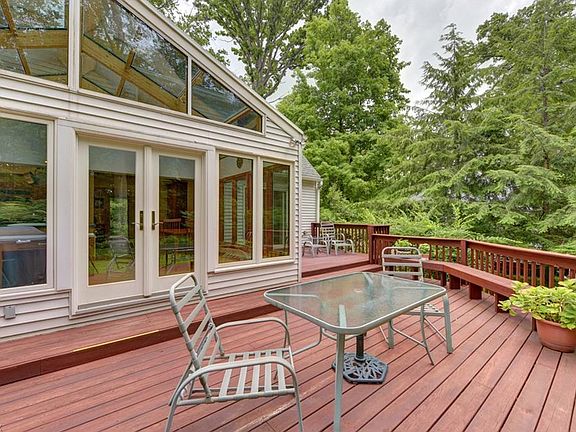 Welcome Home! Beautiful Cape Cod home situated on almost an acre of wooded land! Updated kitchen boasts Vaulted Skylight ceilings, hardwood floors, French doors to a large deck and private yard. Walls of windows let you enjoy nature while you cook! Appliances stay. Wet bar area perfect for entertaining. Living room has WBFP and built-in bookcases and hardwood floors. Master suite on first and second floor!! First floor master has an En suite bathroom, large closets and sliding doors to deck. Second floor master suite has hardwood floors, two large closets and a full bath. Adjoining bonus room is perfect for office or nursery. Tiled breezeway on first. Finished bonus room in basement with fireplace. Great for office or play room! Additional basement area has workbench and washer and dryer. 2 tiered deck with bench seating and water feature. Attached 2 car garage with large brick parking area! Beautiful mature trees and landscaped gardens. Shed on rear property is great for storage.