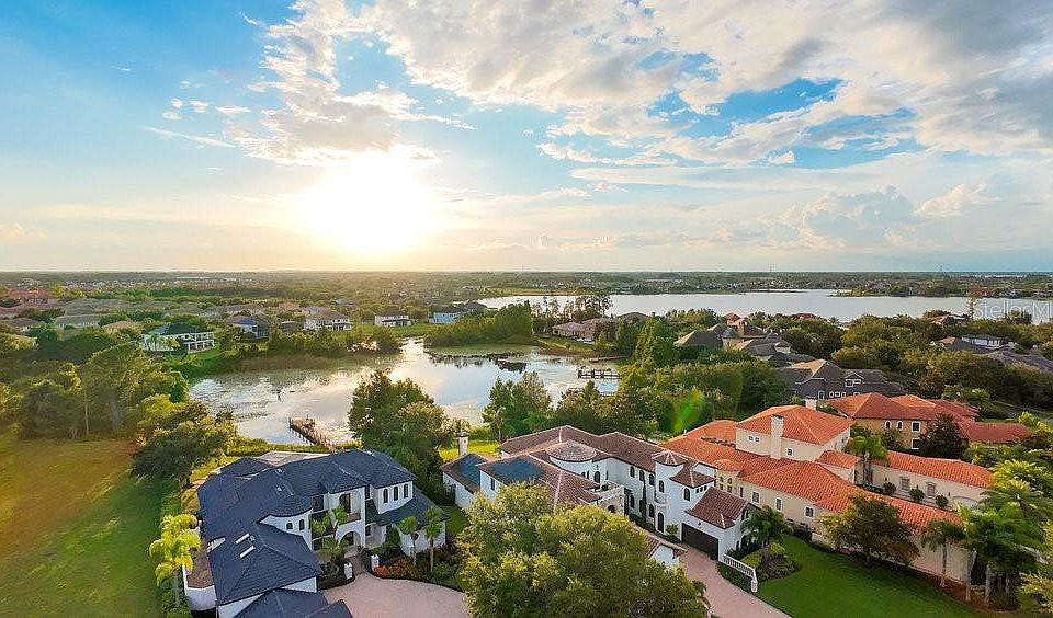 Get ready to enjoy the lake lifestyle in your custom estate poised on a cul-de-sac lot with 110 feet of pristine shoreline on Lake Burden. Recently underwent a $1 million remodel. This masterpiece of a home has it all with 5 bedrooms, 5.5 bathrooms, spacious great room, office, and a large 5 car garage! Your timeless Mediterranean home with contemporary finishes was designed to enjoy the breathtaking panoramic views of sunsets and Disney fireworks over Lake Burden with the utmost comfort and privacy. The grand façade has its own gated courtyard includes lush tropical landscaping complimented with a long driveway, balcony, and large custom double entry door. Upon entry you will immediately notice 12’ soaring high ceilings in the foyer with chic porcelain floors throughout. Sit back, relax, and take in your beautiful lake views from the great room which is open to the kitchen and casual dining space. The chef’s kitchen is a dream come true with a large center island, breakfast bar seating, marble backsplash, Viking refrigerator and dishwasher, Dacor 6 burner range with a vented hood and a walk-in pantry. The elegant dining room is perfect for those formal occasions with its own private courtyard and temperature controlled 1,000+ bottle wine cellar. Work from home in peace with your own office away from the living areas. The primary suite has its own seating area with amazing lake views including two large built-in walk-in closets, spa like bathroom including a glass shower, tub, and dual vanities. All secondary bedrooms are spacious en-suites with plenty of closet space. Relax and enjoy captivating lake views within the serenity of the expansive outdoor living area that is fully screened with your heated pool and water features with premium stone deck pavers. The covered lanai includes an amazing fully equipped summer kitchen for those perfect summer barbeques and get-togethers with loved ones. Gather around the massive sunken firepit for those beautiful star gazing nights. The wooden dock includes a jet ski lift to enjoy all 129 acres of Lake Burden. Your home was built by award-winning builder Campbell Custom Homes and features one-of-a-kind finishes throughout. Additionally, Keene’s Pointe is a 24-hour guard gated community, includes plenty of parks, playgrounds, with access to The Butler Chain of Lakes, The Golden Bear Country Club with amenities that include a gym, pool, golf, tennis courts, and neighborhood boat/RV storage. Close to Orlando’s best attractions including Walt Disney World, shopping, and “A” schools including Windermere Elementary, Bridgewater Middle, and the newer Windermere High School. Don’t miss out on this extraordinary lakefront property. Be sure to click on the virtual tour links.