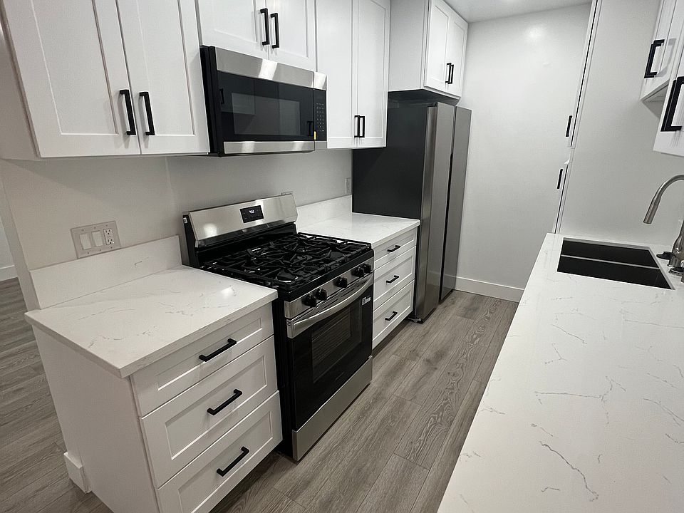 This is a brand new 2 bedroom, 1 bathroom apartment. Brand new hardwood flooring, new tile bathroom, new appliances, kitchen and bathroom. Lots of storage throughout unit. Comes with 1 car garage.