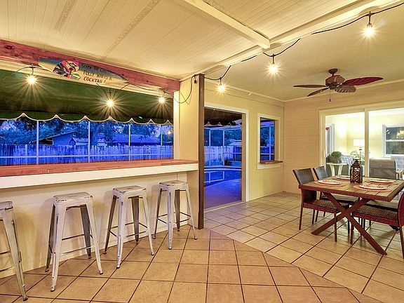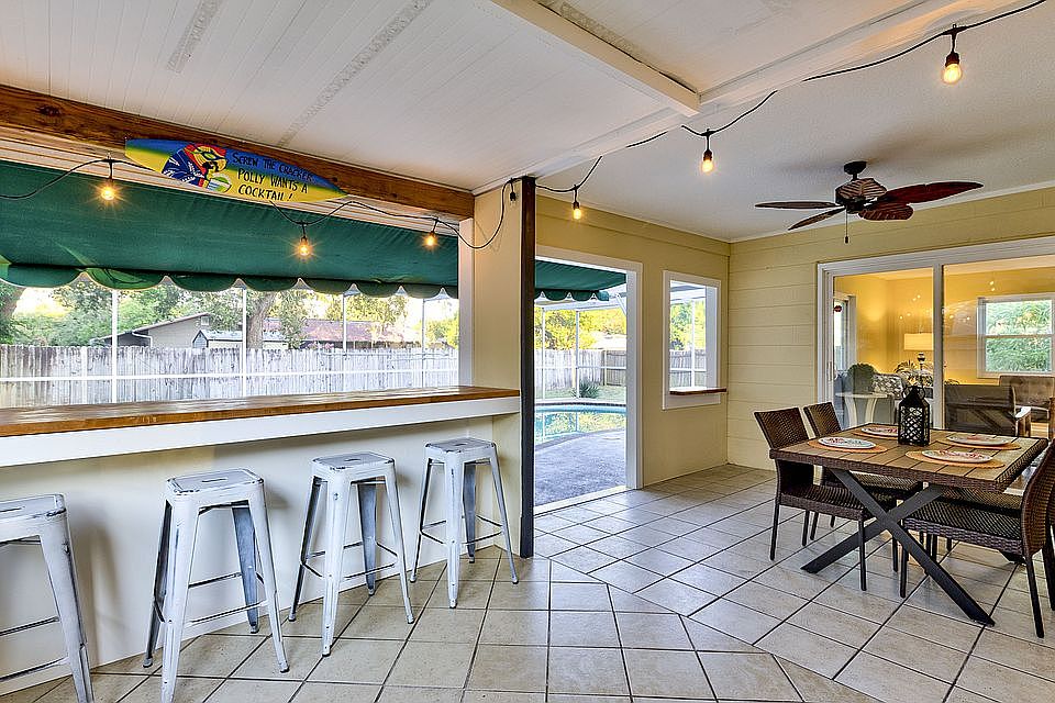 ENTERTAIN MUCH? This remodeled, very spacious 3/2 pool home is sprawling with spaces to entertain friends and family! The back yard is fenced, ideal for pets and children. The back rooms are open to the pool area with loads of bar seating and plenty of room for darts, games and eating. This outdoor, under roof porch space measures a massive 12x20 featuring butcher block bar tops and ceramic tile flooring. Inside, the main living area is an open floor plan with living room, dining room and a bonus family room open to the kitchen. The converted garage is a huge third bedroom adjacent to the wet bar/ kitchenette with exterior access which could be used as an in-law suite or as a master suite with it's own entrance and parlor. The home features interior laundry, newer windows and slider, NO CARPET ANYWHERE and all brand new kitchen appliances. The interior is completely updated and move-in ready, now it's up to you to add your perfect touches with landscaping.