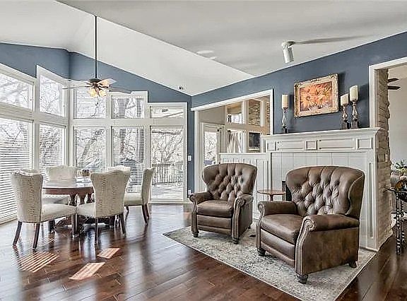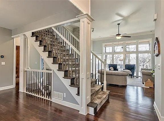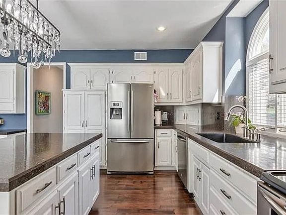 Property is NOT furnished Gorgeous family home in well-established Lenexa neighborhood. Open main level has wood floors, 12' ceilings and abundant natural light throughout. Kitchen features an island, SS appliances, double ovens and cabinets galore. Large laundry/mud room steps away from the 3-car garage. Master bedroom is on the main floor w/fireplace, large bathroom and walk in closet. Upstairs has three large bedrooms and two full baths. Lower level walk-out has 5th non-confirming bedroom/office as well as a full bath. Wet bar and pool table complete the rec space perfect for entertaining! Two doors access the backyard with a new fence.. Covered deck off living room with ceiling fans and a place for a large TV.