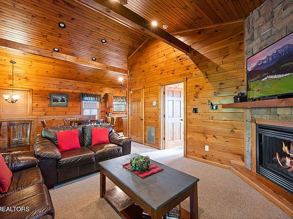 Located just 10 minutes from downtown Gatlinburg, this one-bedroom, two-bathroom cabin in the sought-after Gatlinburg Falls resort offers a prime investment opportunity or private escape within city limits. With nearly 1,500 square feet across two full levels, the cabin is thoughtfully designed for both comfort and rental performance. The main level features an open-concept living room with soaring ceilings, a cozy stacked stone fireplace, and abundant natural light, along with a full kitchen, dining space, and the primary bedroom and bathroom. The lower level expands the living space with a generously sized recreation room outfitted with arcade consoles, a pool table, bunk beds, additional lounge seating, and a second full bathroom—perfect for entertaining guests or maximizing rental flexibility.