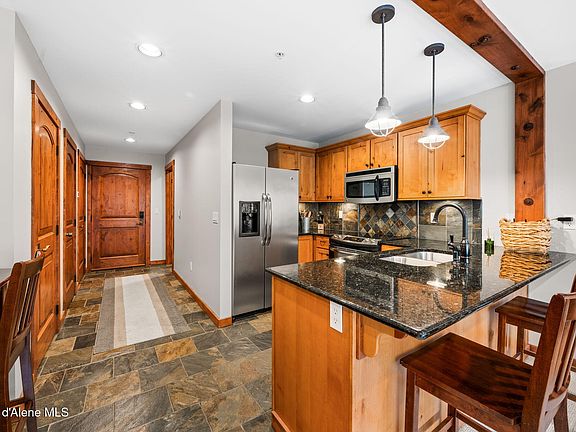 Ideal year-round retreat at the base of Silver Mountain Resort. This pristine, turnkey two-bedroom condo is perfect for outdoor enthusiasts. Freshly painted with brand new carpet throughout, it features stunning granite countertops and stainless steel appliances. Enjoy the largest double covered deck at The Ridge, perfect for entertaining or relaxing. Building amenities elevate your lifestyle with secure access, ample parking, a hot tub, dry sauna, steam room, and equipment storage.