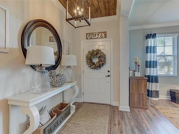 Get ready to fall in love with this beautiful Greyhawk Landings home! This Marco floor plan offers 3 bedrooms, 2.5 baths and a Study, all impeccably cared for and upgraded with a whopping $38,000 of amenities! Your backyard is your private oasis with no neighbors behind you and is lushly bordered with Areca palm trees down the sides where you can relax in your covered extended lanai or lounge in your hot tub that rests on a solid 6" of poured concrete. The interior has been painted in a refreshing pallet of coastal colors which features crown molding throughout, shiplap entry ceiling and shiplap walls, engineered driftwood oak floors, wood window casings, carpeting in the two rooms, brushed nickel fixtures, tray ceiling, plantation shutters and an indoor laundry room with a steam wrinkle option on dryer. The kitchen offers granite countertops, 42" cabinetry, pantry, S/S appliances, gas range, large island with seating and pendant lighting. Other extras include hurricane shutters, tankless hot water heater, whole house wiring for generator, motion sensor lighting, Energy Star rated home with incredibly low $50 - $70 monthly electrical bills including upgraded foil back roof insulation, wood flooring in garage attic for storage, lanai no-see-um screens, removable backyard pet fence, garage keypad entry and security system. The Greyhawk Landing community features a guard gated entry, two pools one of which is an awesome lagoon-style pool with water slide, waterfall and spa, two clubhouses, fitness center, tennis courts, baseball and soccer fields, two playgrounds, 7 mile nature trail for walking and riding your bicycle and a private lake with dock. This one will not last! Furnishings are available separately.