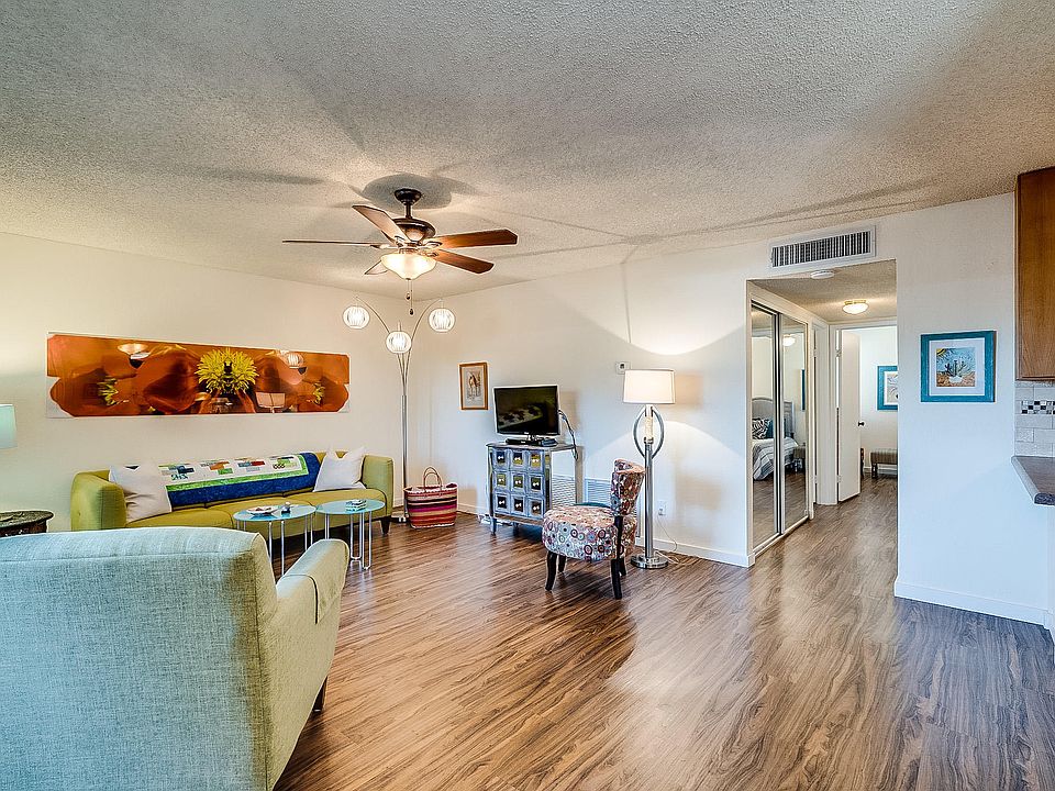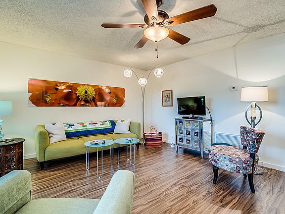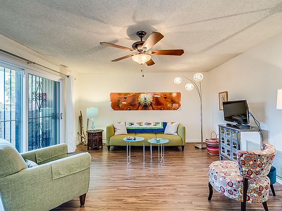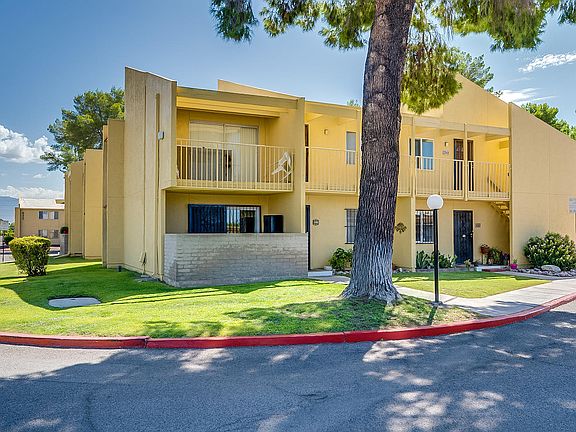 Charming spacious ground floor unit in quiet complex in Tucson's desirable East side. Nice sized two bedroom 2 bath unit with lots of upgrades. New hard floors (Luxury vinyl waterproof planking) and baseboards throughout the unit within last year. Newer hall bath tile shower enclosure and both bathrooms have ample storage. 3 ceiling fans in LR and both bedrooms. Fresh paint throughout. Includes all appliances, stackable washer/dryer, and newer kitchen cabinets. Covered, assigned parking space just outside unit. Lovely grounds with grass and luch landscaping. Community pool and spa. Private patio in the shade of an adjacent tree. Newer slider doors from living room to private patio. Master bedroom features walk-in closet. HOA fee includes hot water so no need for water heater.