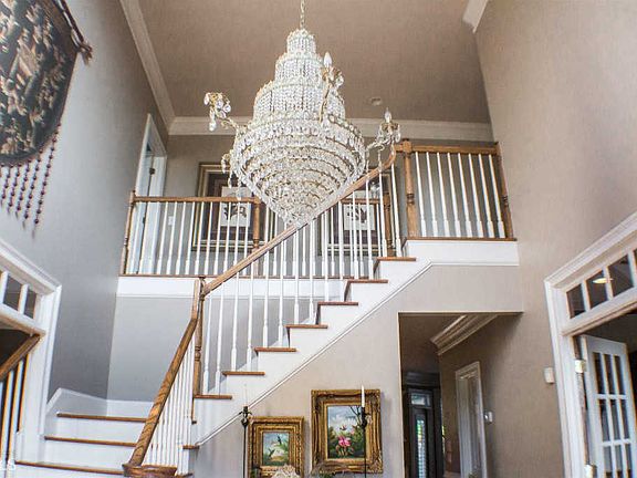 Impressive 2-story on hill w/ towering views! 2-story foyer with dramatic crystal chandelier welcomes you to open kitchen w/ lovely stone finishes. Opens to striking 2-story family room with stone gas fireplace with an abundance of natural light. Hardwood floors throughout and separate entry basement with bed/bath..perfect for in-law ste. Master ste opens to updated bath w/ soak tub and spacious custom closet. Custom cabinets and granite look floor3 car garage. Private back yd with patio/fence and flowering shrubs. <2year old roof and fresh exterior paint.