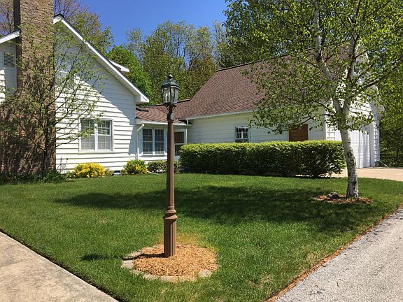 Tucked up on a hill with peek a boo views of Portage Lake,and less than .25 mile from the lake, this solid 3 bedroom, 2.5 bath home is located on almost an acre. Enjoy the wooded back yard, with a peaceful stream and located on a culdesac in the heart of Onekama! Large living room with bay window. Lots of natural light flows throughout home. Brick wood burning fireplace in living room. Home has a nice size dining off Kitchen and nice sized breakfast area. Large Primary bedroom located on main floor with ensuite. Whirlpool tub in bathroom, 2 large closets with built ins. A lovely 3 seasons sunroom is off of the spacious family room. 2 car attached garage with stairs leading up to spacious floored storage area. A new roof, partial siding, garage door, 7 windows and gutters to be installe