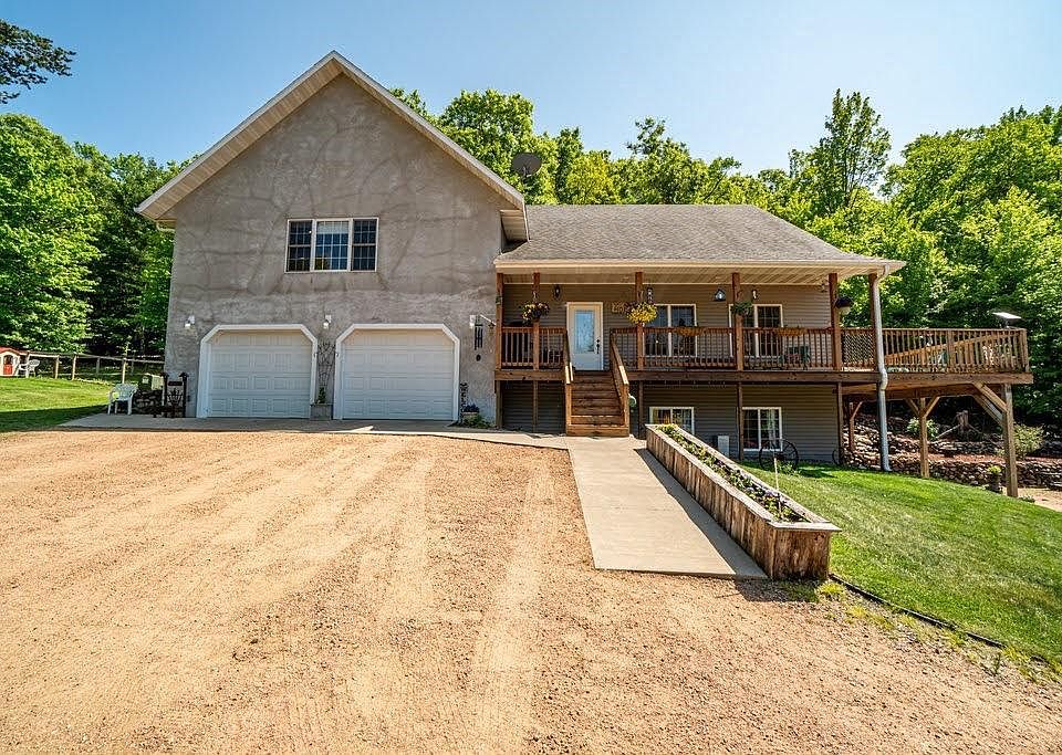 This beautiful 3-bedroom, 3.5-bathroom home is perfect for those who desire peace and quiet with 5 acres to call their own. Enjoy the outdoors even more with the wrap-around deck overlooking the waterfall in the landscaping, perfect for enjoying your morning coffee or evening sunset. You'll find in-floor heat in the lower level, detached shop, and attached garage. The wood stove keeps you warm and cozy during the colder months. The kitchen boasts hickory cabinets, a gas range, and a breakfast bar making cooking a breeze. The master suite is a true highlight of this home, with two large walk-in closets, a bathroom, and an office, this space is an oasis all its own. Additional features include a walk-out lower level, and a 24X30 in-floor heat detached shop - perfect for storing your vehicles or working on projects.