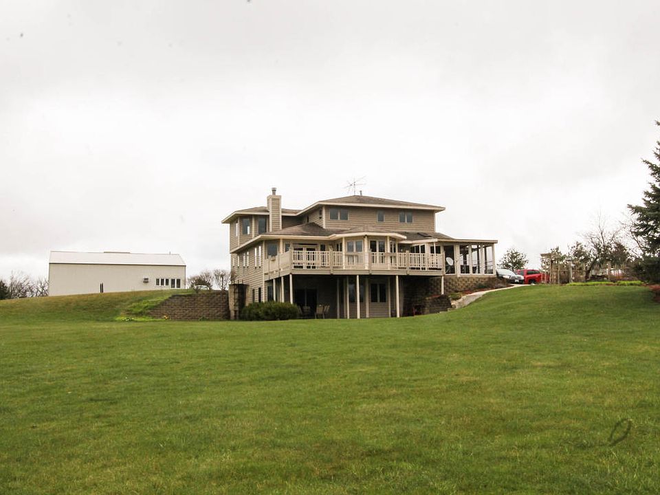 Custom designed 4 BDRM,4 BA home w/2 car att.garage on 5 acres w/panoramic views offers productive apple orchard & plenty of space for horses. The entry w/oak hardwood & walnut inlaid floor leads to vaulted ceilings, skylights, & great room w/French doors to your large deck. Kitchen has walkin pantry, built in desk & leads to brick paved screened porch. Upper Master Suite w/whirlpool tub, walkin shower & dual sinks. Finished LL w/cherry & oak bar, cellar, dining, bdrm, full BA & walkout to covered patio. Fresh stained exterior & painted deck. 36x84 outbuilding w/shop & storage has heat & A/C.