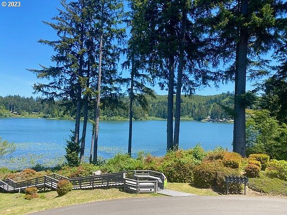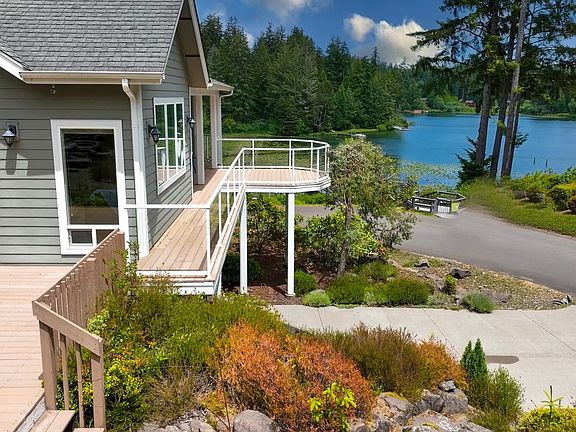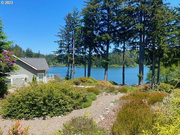 WOW! Welcome to this luxurious lakefront retreat on Siltcoos Lake, located in the scenic coastal town of Florence, Oregon. This exceptional property offers a harmonious blend of elegance, comfort, and breathtaking natural beauty. Pull into the oversized garage & take the stairs or the elevator to the 2nd story main living quarters & get ready to be wowed by the scenery! Upon entrance, you'll find an open-concept layout, creating a seamless flow between the living, dining & kitchen areas. Expansive windows adorn each room, allowing natural light to flood in while offering mesmerizing views of the glistening lake. The spacious kitchen provides everything the entertainer in you desires, ample counter space, a large breakfast bar and an adjacent formal dining space that features floor to ceiling windows that frame the serene lake vistas, providing an idyllic backdrop for memorable meals with family & friends. A cozy double-sided fireplace in the main living room provides warmth & ambiance in the great room as well as while dining al fresco out on the deck. The main suite is a private oasis of relaxation, featuring a generous bedroom with panoramic lake views, a cozy fireplace, and direct access to the decks and professionally landscaped gardens. The ensuite offers doubles sinks, a jetted tub, heated tile floors, towel warmer & walk-in shower for that spa-like experience. Downstairs you will find a large family room with deck access, 2 additional guest bedrooms with lake views & a full bath. A privately shared dock provides convenient access to the lake, perfect for boating, fishing, or simply embracing the beauty of nature.