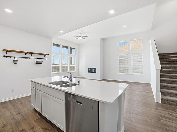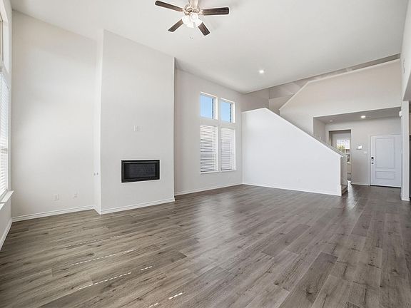 Cozy brick fireplaceSky-high ceilingsOpen concept floor planHardwood flooringBack patioLarge dining areaGranite countertops