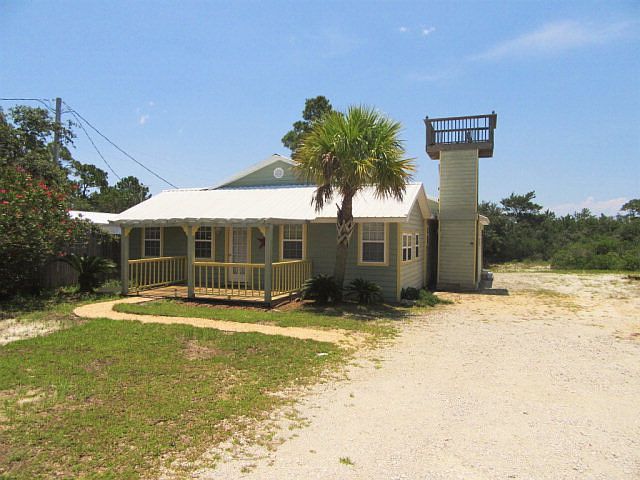 Palm trees line the driveway to this adorable beach cottage with a pergola & lookout deck, offering amazing views of the Mobile Bay & Glimpses of the Gulf of Mexico! The home has been totally remodeled. The updated kitchen opens to a spacious living room. The 34' x 10' covered back porch/deck is a great place to relax & dine. The home is sold totally furnished inside & out(with the exception of 2 framed posters) & is move-in ready! This could be a great vacation home, long term or vacation rental. A buyer will enjoy nearby access to a sugar white sand natural beach, world class golfing, a marina, boat launch, Ft Morgan, Mobile Bay Ferry to Mobile, restaurants & a short drive to the Gulf Shores attractions & shopping. Subdivision Amenity: Residents of Gulf Highlands enjoy access to the beach, per plat. Dimensions & information deemed accurate but based on public records. Buyers should verify all information. The Suzuki Samurai at the property may be sold separately,.
