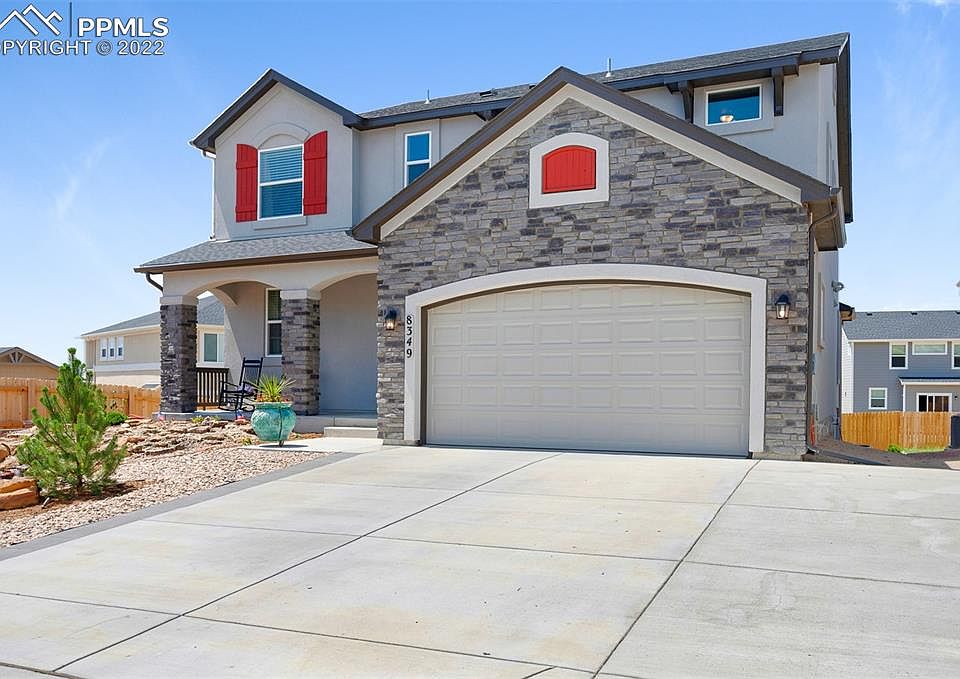 Stunning, like-new Sterling Ranch home with every upgrade available and incredible mountain views! Enjoy quiet evenings on the covered front porch overlooking the professionally xeriscaped yard with a breathtaking water feature that sounds like a babbling brook. This home is filled with high-end finishes and plenty of large windows to bring natural light and show off the views. Grand open floorplan enhanced with high-end plank flooring, a vertical fireplace, gorgeous white quartz stacked stone surround, and a beautiful wood mantel. Gourmet chef-worthy kitchen boasts quartz countertops, under cabinet lighting, large pullout drawers, a farmhouse apron sink, desirable gas range inset convection oven and microwave plus a dreamy walk-in pantry. Garage is located off the kitchen via a wonderful mudroom with built-in shoe cubbies and coat hooks. Main-level formal dining room great for large dinner parties, and a private home office entered from a charming French door. Upstairs, enjoy a spacious loft area and four generous-sized bedrooms, including the primary retreat featuring striking mountain views, tray ceilings, large walk-in closet, and a spa-inspired 5-piece en-suite bath featuring a deep, freestanding tub with stunning views of Pikes Peak and a large shower with spot-resistant glass! Convenient upstairs laundry room with included oversized washer and dryer makes laundry day easy. Beautifully finished full basement with garden-level windows to let in great natural sunlight and 10’ ceilings. Enjoy entertaining in the extensive family room with a built-in wet bar with full-size refrigerator and leathered granite countertops. Additional bedroom and nearby full bath perfect for guests’ privacy.  Outdoor living can’t be any finer than on the partially covered composite deck with mountain views and covered lower patio that overlooks the property’s spacious backyard. You'll love this quiet, close-knit community with easy access to N Powers shops and restaurants