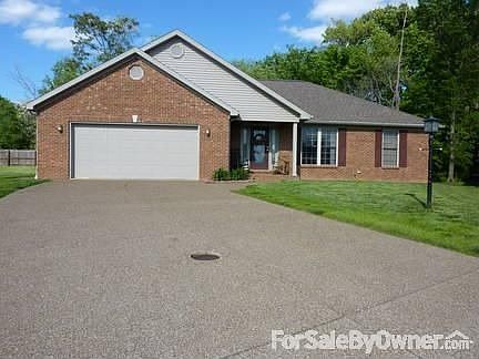 Single story brick ranch built in 2003. Home is built on a cul-de-sac in beautiful Fawn Creek Subdivision. Cathedral ceilings and column in living room with gas log fireplace and double mantel. Kitchen has cherry cabinets, stove, dishwasher, disposal, microwave, and pantry. Walk in closets in all three bedrooms. Master bathroom has seperate shower, raised double sink and whirlpool tub. Covered back porch overlooks nice yard with yard barn for mower. 2.5 car garage has nook with utility sink. Lake privileges in subdivision. Call 812-589-4055 or 812-306-8329 to make appointment for showing. Lloyd Exp to University Parkway(USI), North then right on Houge Rd. left on Eickhoff into Fawn Creek Estastes. Home at top of hill on Antler Ct.Additional property info: http://www.forsalebyowner.com/listing/3-bed-Single-Family-home-for-sale-by-owner-835-Antler-Ct-47712/23947725?provider_id=28079