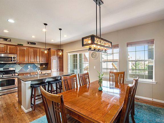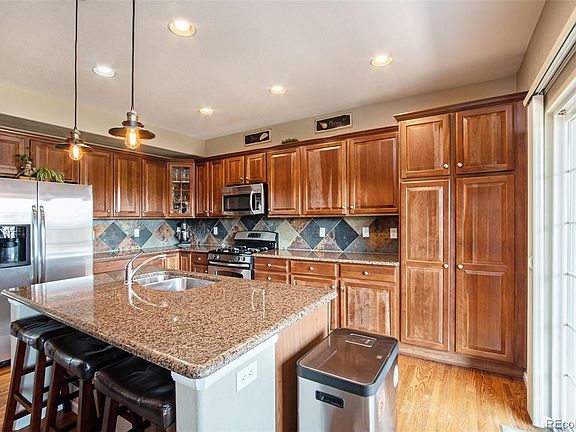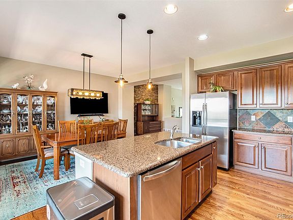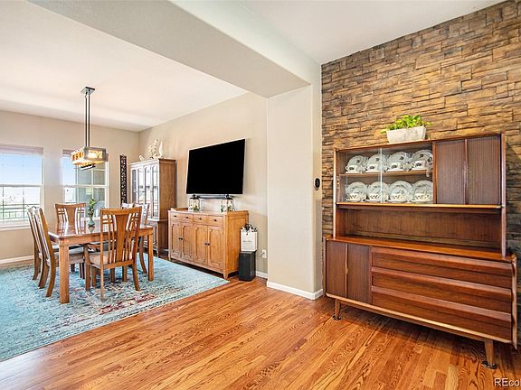 Welcome to this stunning Brownstone at Town Center! This beautiful 2-story townhome boasts exquisite details throughout. The inviting, spacious floorplan is filled with natural light from numerous windows. Enjoy gleaming wood floors, a stack stone gas fireplace, custom accent paint, and elegant light fixtures. The living room flows into a cozy reading nook and a generously sized dining room, adjacent to a spectacular kitchen with a granite slab island, custom cabinets, pendant lighting, slate tile backsplash, stainless steel appliances, ample pantry storage, and recessed lighting. Step through the sliding doors onto the covered balcony for serene park views with no buildings behind. Nestled away from noisy streets and between two parks, this home offers exceptional outdoor access. Enjoy the park right out your front door or relax on the balcony overlooking another beautiful park with a pond. Walk to the Highlands Ranch Town Center. The second floor features a large primary bedroom with neutral carpet, accent paint, a ceiling fan, ample natural light, a walk-in closet, and a stylish primary bath with tile floors and neutral colors. The second bedroom is spacious with a ceiling fan and large window. The loft/den area is perfect for a home office or TV room. Plus, the upstairs laundry room adds greater convenience. The lower level includes a half bath, ample storage and access to your 2-car attached garage. New in 2023: water heater, furnace, dishwasher, and front storm door. This home shows like a model—you’ll love it!