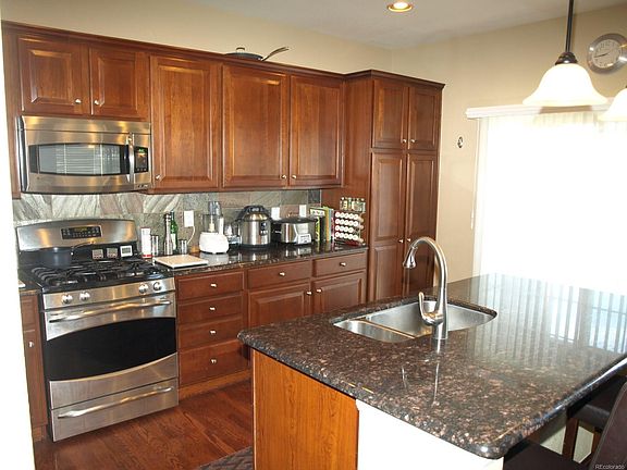 3 Bedroom 3 Bath Highlands Ranch End-Unit Townhouse with 2-Car Attached Garage in Like-New Condition. Main Level has 9 foot ceilings with Hardwood floors. Step Down Kitchen includes Granite Slab Countertops with Tile Backsplash, Cherry Cabinets and Pantry, GE Profile stainless steel appliances including gas range, and large Island. Living Room has 11 foot ceilings and includes a gas fireplace and entertainment nook. Dining Area and Family Room are also included on the Main Level. All 3 bedrooms are located on the Upper Level along with the Laundry Room. Master Suite includes a walk-in closet and a spacious bathroom with double sinks. Garage Entrance is off the rear of the building and is located on the lower level. Garage has direct access to the lower level which also includes 2 separate basement/crawl space areas with concrete floors and plenty of headroom. Powder Room is also located on the lower level. Town Center includes all of the wonderful Highlands Ranch amenities.