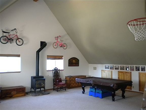 Pack the family and the toys...!! This one is ready for summer or winter fun. Equipped with a wood paneled indoor basketball court. big enough for a great 2 on 2 match or just practice the free throws. Huge upstairs game room with all the toys. Home includes many fine finishes. Knotty pine floors and cabinets, surround sound, accent lighting, and a river rock hearth surrounding the warm and cozy woodstove. Spacious kitchen with great storage and an oversized pantry. Extra deep garage would easily accommodate two cars and all the toys. Landscaped front and rear. Private rear patio is great for those evening BBQ's. Southern exposure for nice morning sun and afternoon shade. This one is ready to go..!