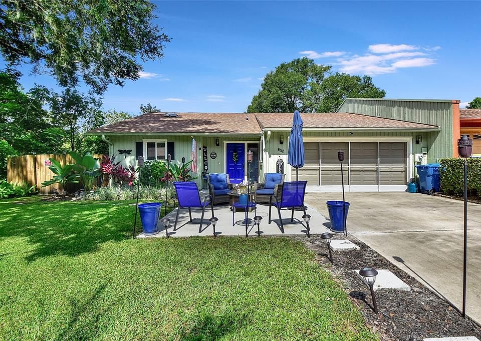 Introducing a charming two-bedroom, two-bath Villa in the vibrant community of Brandywine. From first site of this home you can tell the sellers love the outdoors, with a beautiful extended front porch that you can watch the shuttle from, to the solar lights that illuminate the whole front yard. This Villa offers a cozy and spacious living space, perfect for individuals or couples seeking comfort and convenience. Owners have recently updated new Pergo flooring through most of the home and a new shingles roof. The main living area provides ample room for relaxation and entertainment, while the two spacious bedrooms offer versatility and comfort. Off the main living area is a spacious covered lanai and enjoyable patio overlooking a large lush back yard. The oversize 2 car garage houses the washer and dryer with built in storage. Call today, Don't let this one get by you