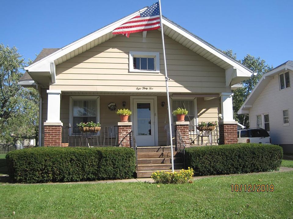 Very well kept Bungalow with 3 Bedrooms. there is room in the kitchen for a small table and chairs. Back Bedroom has a separate door to the outside but needs steps to enter from the outside. There is a 2 car garage in the rear accessed from the alley. It has a concrete apron big enough to park a car. Garage has electricity and also 2 openers. The furnace was serviced last year and the Air conditioner in the dining room cools the entire home.Back yard is fenced. Bathroom has a walk in shower. Window treatments stay.