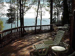 Year round home on Madeline Island with over 300 feet of lake frontage, detached garage with roughed-in guest quarters above, bonus room, loft bedroom upstairs, sharp kitchen, wraparound deck & southeast Lake Superior view through a wall of huge windows.
