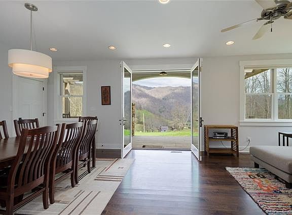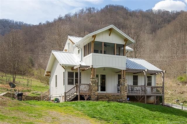 Embracing farmhouse overlooking a pastoral valley with a bold stream that tumbles over moss covered rocks and is framed by three tobacco barns from yesteryear. This modern and environmentally conscience build boasts geothermal HVAC, solar electricity, pure well water, and off the grid potential. 15 minutes to downtown Marshall and 42 minutes to downtown AVL. These 63 acres have blueberries, raspberries, figs, apples, persimmons, and black chestnut trees plus birds galore. Shake off the stress and enjoy inspiring quiet.