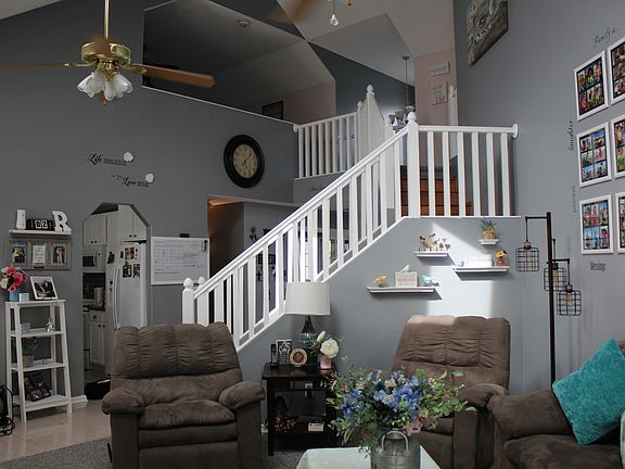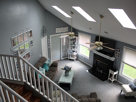 Beautiful 1 1/2 story home located across the street from Deer Run Golf Course. Small town living at its finest. Home sits on two lots and is on a Cul-De-Sac. Enjoy relaxing on your front or back porch and enjoy the wildlife and the peace and quiet. This home is move in ready and handicap accessible. Featuring spacious vaulted ceiling, gas fireplace, ceiling fans, main floor laundry with built in ironing board, dining room, and eat in kitchen with walk in pantry. French doors open to large office. You will enjoy the master bath with jetted tub, large shower and walk in closet. Master bedroom has sliding door to four seasons room which leads to large back deck. Upper level features large family room, loft that overlooks living room, bedroom with large walk in closet and half bath. Lower level has a newly finished family room with wet bar, large workshop with built in tool cabinet, storage area, full sized bathroom and new 1+ bedrooms with walk in closets. You will enjoy beautiful landscaping with new and established plantings as well as a spacious fenced in yard for your entertaining. Three car garage with 14 ft. ceilings with garage door openers. Entryway to basement workshop and main level. Handicap accessible with ramp in garage that leads to main level. This home has many new updates which include new roof and gutters (Fall 2018), four new skylights with shades (2019) and newly done landscaping with an array of flowers and trees. Inside has been freshly painted with updated bathrooms, new flooring, newly finished downstairs family room with 1+ bedrooms and several new windows and blinds. Newly replaced items include heat pump (2019), two water heaters, booster pump, thermostat, new fridge (2019), trash compactor (2019), microwave and garbage disposal. Front and back decks have been freshly stained (2019).