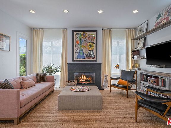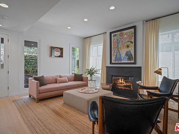 Welcoming fireplaceMature landscapingCustom reclaimed woodworkPalm tree viewsOpen layoutAccordion glass doorsInviting living spaces
