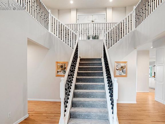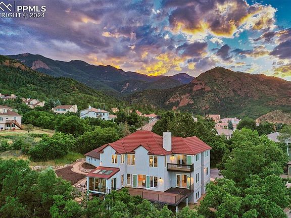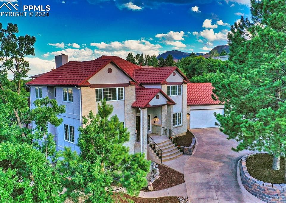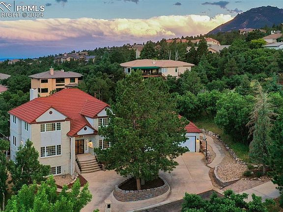This majestic custom home exemplifies luxury mountain living w/ a casual elegance. Large windows throughout the home showcase spectacular mountain & city views from all levels & every room. Impress guests as they walk up the custom walkway to the double-door entrance to find a grand foyer w/ gorgeous staircase. All new carpet & natural oak wood flooring throughout the home. The Formal living w/ Butler's pantry nearby & dining room sit across from each other. The wood paneled office exudes character & walks out to the deck. The powder room is discreetly tucked away. The heart of the home is the Great room w/ a gas fireplace surrounded by custom shelving & double doors leading to a huge Trex deck & entertainers dream. Show off your breathtaking city & mountains views. The Kitchen is Designed for True Gourmet Cooking, w/ all new Gas cooktop, Double Ovens*Custom Drawers and Cabinets. Gorgeous Slab Granite Island, large pantry. Adjacent is the sunroom. Large Main-level laundry has a ton of storage & wet sink. The owner's ensuite is impressive w/ gas fireplace, a sprawling walk-in closet, spa-like bathroom, sitting area w/ dazzling views from your private balcony. Two more bedrooms have walk-in closets & OWN bath. Garden level has a huge walk out family room, wet bar, new appliances. Walk out to the patio seamlessly to the natural outdoors. Two more bedrooms share a Jack and Jill bath w/ granite double vanity. Poured paved sidewalks wrap around each side of the home. The oversized 4-car garage has plenty of room for your cars and toys. New interior paint, solar & so much more. This Home's Stucco Exterior w/Concrete Tile Roof Keep the Exterior Maintenance at a Minimum. Local wildlife & surrounded by nature. Discover the pinnacle of Colorado Springs living at Top of Skyway. Award winning School District 12, Bear Creek Park's Hiking*Biking Trails*Dog Park, *Old Colorado City, Downtown, Broadmoor, I-25 & the Hwy 24 Corridor to Ski County make this an Ideal Location!!