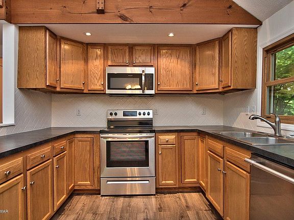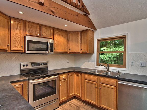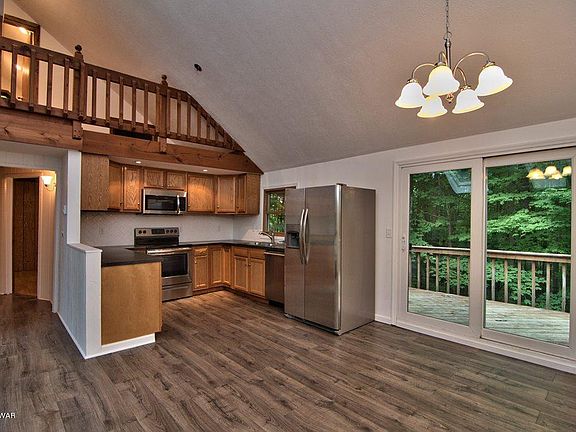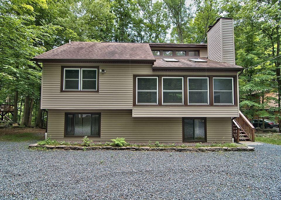 Everything has been done for you in this beautifully updated home; located in a four season amenity filled community in the Northern Poconos.  Modern updates with a woodsy feel creating the highly coveted rustic chic style.  Open floor plan with vaulted ceilings, new Pergo flooring throughout, living room fireplace, and brand new appliances!  Finished lower level with family room, new bathroom, and 4th bedroom plus additional room that could be another sleeping area or office. There's also a beautiful chimney in the lower level for the option of adding a stove or a second fireplace! There's a cozy bedroom on the second level too, making this home a 4 bedroom, 2 bath home. Nice private setting with a level lot and circular driveway.  Convenient location close to amenities.