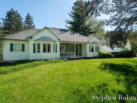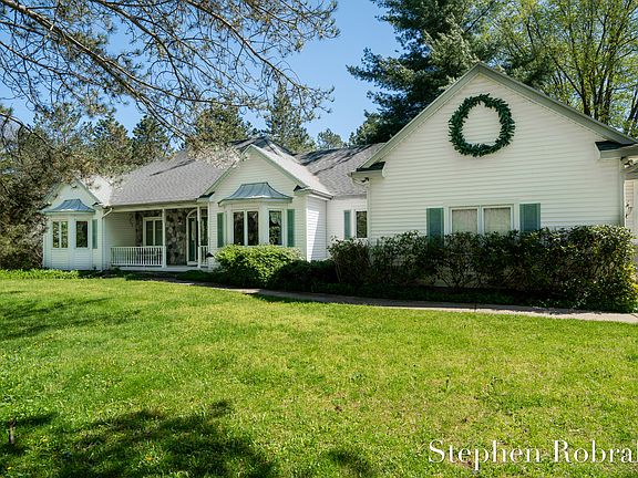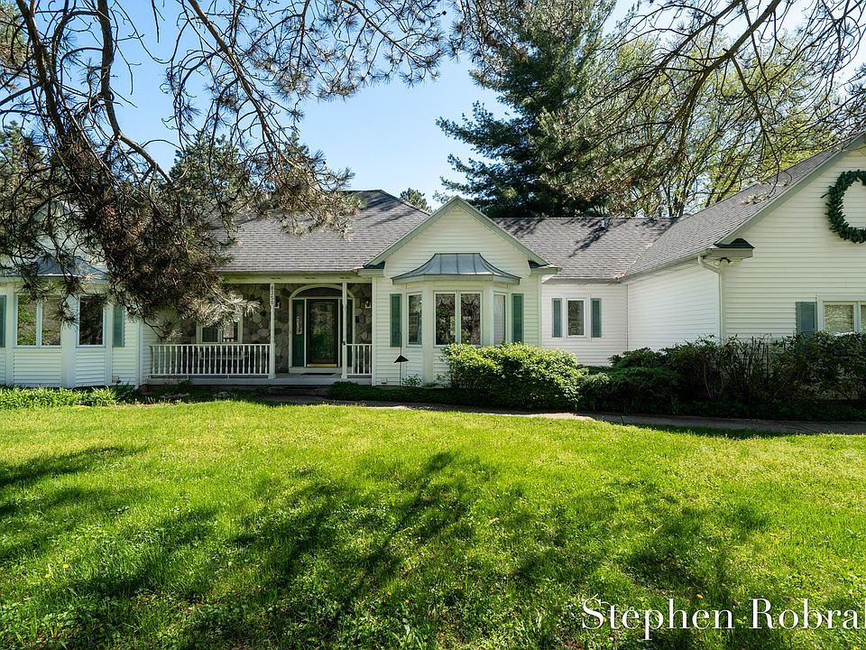 Inside, you'll find 4 bedrooms and 3.5 baths. The living room features 9' ceilings and cherry crown moldings, accompanied by a stone fireplace. The dining room boasts a bay window and built-in cherry china cupboards. The kitchen is equipped with a center island and elegant cherry cabinets. A 4-season sunroom with skylights adds natural light to the space.