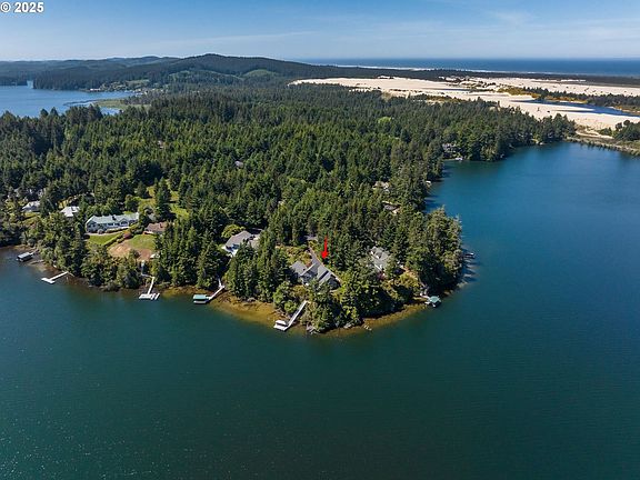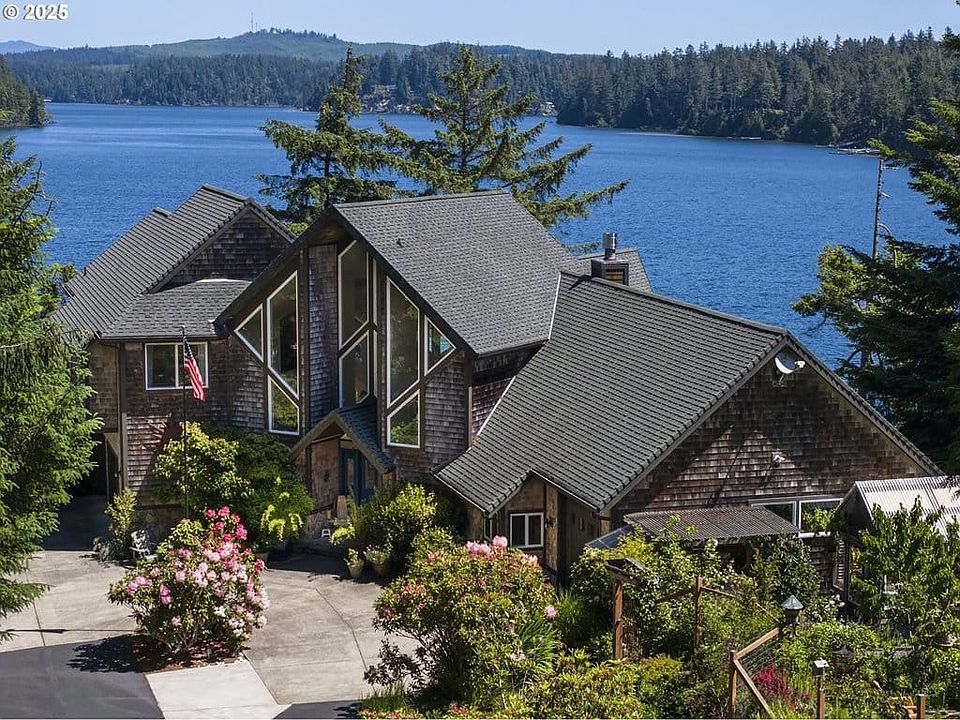 Experience breathtaking panoramic views from this exceptional lakefront retreat located in the prestigious gated community of South Shore. With high-bank, 180+ degree views of Woahink Lake, this home offers unmatched elegance and comfort. Soaring cathedral ceilings and a wall of windows flood the main living area with natural light and frame the stunning lake views. The gourmet kitchen is perfect for the home chef, featuring quartz countertops, KitchenAid stainless steel appliances, a 36 Bosch induction cook top, walk-in pantry, a large island and peninsula bar. The breakfast room leads to a lakefront deck for outside entertaining. Retreat to the main-level primary bedroom and ensuite complete with cathedral ceilings, a private lakefront deck, jetted tub, custom shower, and private water closet. The upper level offers three guest bedrooms as well as a full bathroom and den, providing ample space for family and visitors. This property is a private outdoor oasis, including a dock and boat lift--perfect for water enthusiasts. The South facing deer-fenced orchard and garden area boasts a variety of fruit trees, flowers, greenhouse, garden shed and charming pergola with a deck to enjoy sunny afternoons. The finished 32x16 RV garage/shop with 3 skylights & upper windows is equipped with 30 amp, 220 volt, 12' door plus oversized finished & insulated double garage with door leading into the kitchen. A dog run with doors into the garage & laundry room keeps the critters accessible and happy. This home combines luxurious amenities with unparalleled lakefront living. Amenities list attached for further details. Schedule your private tour today. 2025-08-11