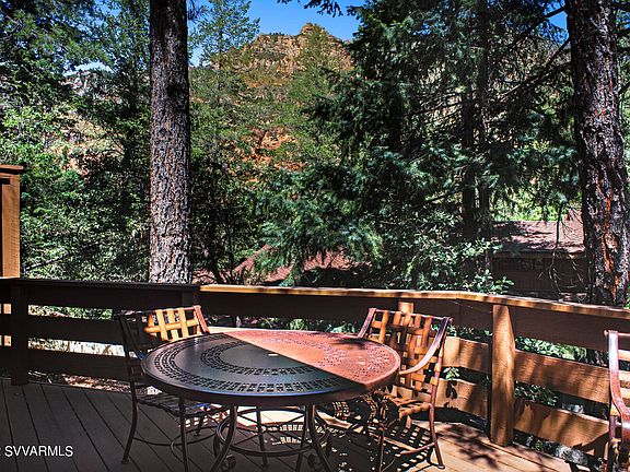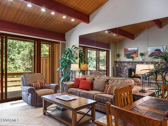 Oak Creek Canyon RETREAT! A 2 bedroom / 2 bath ultra upgraded townhome in the forest, perched in a quiet hillside location. Rent out nightly, STR or live here year round. Mountain Lodge style interiors & FURNISHINGS CONVEY! Extensively remodeled kitchen & bath, granite peninsula, rough hewn wood vaulted ceilings with wood burning, river rock & Kiva fireplaces. Fabulous inside / outside living enjoyed from BOTH primary suites, & wrap redwood deck. Floor to ceiling windows, to witness nature's every splendor. Stroll along 10 acres of common area, or private trails - easy to strenuous trails along year round spring fed Oak Creek. Voluntary Onsight Vacation Rental Program for ease or rent out yourself or not at all. YOU CHOOSE. 2022 JRO onsite program generated $67,061. in Gross Revenue. Have your agent set up an appointment