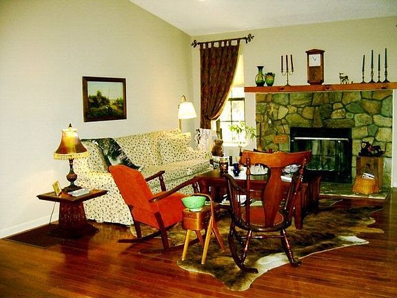 This cottage style mountain home is located in very private setting on three lots. The second level of the home features a great room with wood floors, stone fireplace and sliding doors that open to a large deck that runs across the back of the home. Also on this level are the master bedroom with full bath, two additonal bedrooms, another full bath and the kitchen and laundry area. The first level features an easy access 2 car heated garage, family room/den with Comfort Glow cast iron stove, the fourth bedroom and full bath. Sliding doors from the den open to the back yard. There are two access panels that lead to an unfloored attic. Plumbing is in place in den for a kitchenette or wet bar.