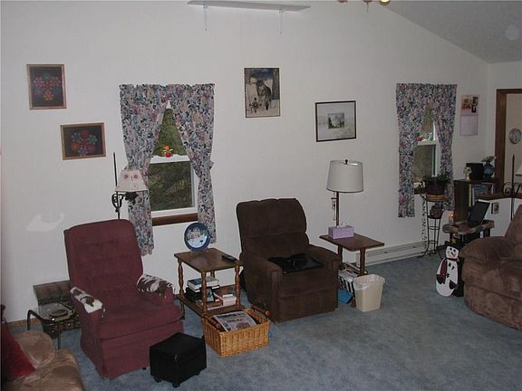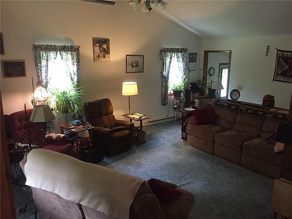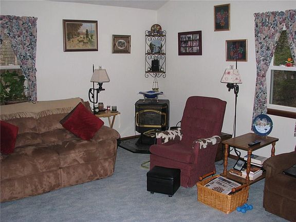 Pleasant one-owner home situated on 6 wooded acres in quiet country setting. Spacious first floor family room with vaulted ceiling and pellet stove. Two full baths on upper level. Hardwood floors in DR & kitchen. Lower level has a den with pellet stove and an office or spare bedroom. Also has two walk in storage rooms and a utility room. Electric heat/ac pump with supplemental baseboard and two pellet stoves. Detached garage w/opener. Surrounded by wildlife and nature!