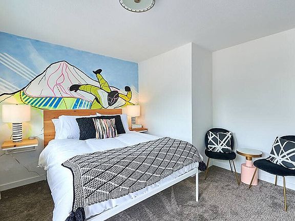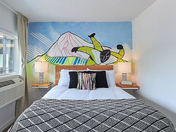 The Snow Suite at the Kenton Hotel is a boutique hotel room featuring a queen bed and a full bathroom. Each room has a private entrance from the exterior and offers self check-in. Located in the heart of the Historic Kenton neighborhood, this locally owned and managed boutique hotel has deep roots in the community. With art-filled and eco-friendly rooms, the newly renovated 1962 Motel embodies the essence of Portland and Oregon as a desirable travel destination. The Kenton Hotel experience is designed to immerse you in the best that the Historic North Portland community has to offer. From the inviting ambience of the exterior living room to the convenient location with easy access to Portland's most desired destinations, your stay will be one of a kind. Each room features a unique themed mural highlighting Oregon's most picturesque locations, making the Kenton a true representation of all things Oregon. The hotel offers a pet-friendly environment with a pet fee of $50 per stay, allowing a maximum of one dog per stay. Only dogs are allowed, and restricted breeds such as Rottweilers and Pit Bulls are not permitted. A $100 fine will be charged for pet policy violations. Smoking is only permitted in the outdoor patio area, with a $250 fee for evidence of smoking inside guest rooms. A $50 fee applies for lost or unreturned room key cards. Situated in the heart of the Kenton neighborhood, this professionally managed boutique hotel is surrounded by a vibrant community. Nearby dining options include Kenton Station Restaurant and Pub, Presso Coffee Bar, and Posies Bakery & Cafe, among others. A $100 minimum fee will be charged for any violation of house rules. The unit is equipped with a smoke detector and a NoiseAware device. No houseplants or outside foliage are allowed in the rooms, and no outside appliances such as coffee makers, hot plates, or stoves are permitted. Guests may be asked to provide a copy of a government-issued photo ID, confirm contact information, and provide a valid credit card matching the name on the ID. A verification process, including a possible criminal background check, may be required in some instances. A $100 fine will be charged for pet policy violations.