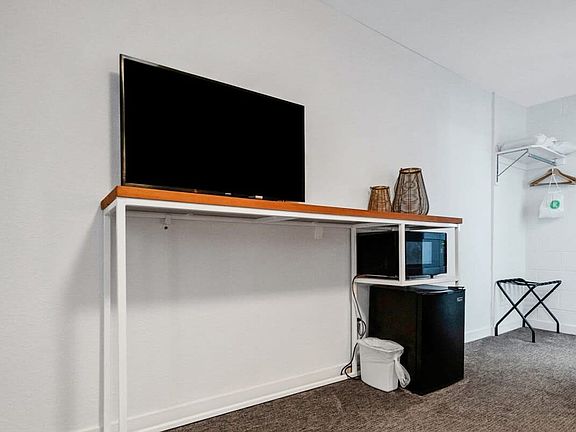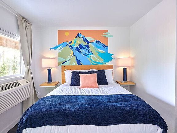 The Mt. Hood Suite at the Kenton Hotel is a boutique hotel room featuring a queen bed and a full bathroom. Each room has a private entrance from the exterior and offers self check-in. Nestled in the heart of the Historic Kenton neighborhood, this locally owned and managed boutique hotel boasts deep roots in the community. With 18 art-filled and eco-friendly rooms, the newly renovated 1962 Motel embodies the charm that makes Portland and Oregon such desirable travel destinations. The Kenton Hotel experience is designed to immerse you in the best that the Historic North Portland community has to offer. From the inviting ambiance of the exterior living room to its convenient location with easy access to Portland's most desired destinations, your stay will be one of a kind. Each room features a unique themed mural highlighting Oregon's most picturesque locations, ensuring a memorable visit. Pets are welcome with a fee of $50 per stay, with a maximum of one dog per stay. Only dogs are allowed, and restricted breeds such as Rottweilers and Pit Bulls are not permitted. A $100 fine will be charged for pet policy violations. Smoking is only permitted in the outdoor patio area, and a $250 fee will be charged if there is evidence of smoking inside guest rooms. A $50 fee will be charged for lost or unreturned room key cards. Situated in the heart of the Kenton neighborhood, this professionally managed boutique hotel is surrounded by a vibrant community. Nearby, you'll find a variety of dining options, including Kenton Station Restaurant and Pub, Presso Coffee Bar, and Posies Bakery & Cafe. A $100 minimum fee will be charged for any violation of house rules. The unit is equipped with a smoke detector and a NoiseAware device. Self check-in is available for guest convenience, and there is limited physical presence on the property.