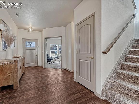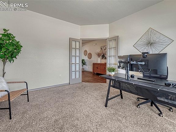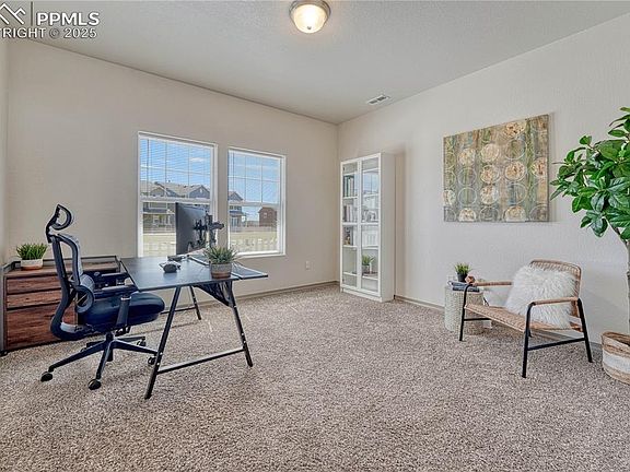 Magnificently Spacious Move-In Ready Home with Bonus Loft and Stylish Primary Suite! Tucked away on a cul-de-sac street in the highly coveted community of Trails at Forest Meadows, this 3BR/2.5BA residence enriches life with desirable features, posh upgrades, and supreme functionality. Providing a welcoming aesthetic, the home has a covered front porch, low-maintenance landscaping, and newer exterior paint. Beautifully painted in a rich red hue, the front door invites you to explore the well-maintained interior. Discover high 9’ ceilings, gorgeous luxury vinyl plank floors, newer neutral paint, chic gold fixtures throughout, powder room, and an elegant home office with French doors. Host gatherings in the open concept living area, which delights with a refreshed gas fireplace. As you prepare meals and mix beverages, be part of the party in the open concept gourmet kitchen. Impress guests with stainless-steel appliances, granite countertops, walk-in pantry, dual stainless-steel sinks, electric stove, dishwasher, built-in microwave, side-by-side refrigerator, storage island, and an adjoining dining area with outdoor access. Relish in the convenience of the fenced-in backyard with a concrete patio, vinyl fencing, and quality turf. Sensationally upgraded with built-in entertainment shelving and a ceiling fan, the sundrenched upper-level loft provides an incredible flex space for streaming marathons or game nights. Made for blissful evenings, the oversized primary bedroom has a ceiling fan, custom walk-in closet, and an en suite boasting a soaking tub, separate shower, and dual sink vanity. Other features: two-car garage, second-floor laundry with utility sink/storage cabinets, Ecobee thermostat, sizable guest bedrooms, under stair storage, easy access to Fort Carson, Shriever, Peterson, and USAFA, quick access to Powers Corridor & I-25 for easy commutes, near shops, restaurants, entertainment, parks, and schools, and much more! Schedule a tour today!