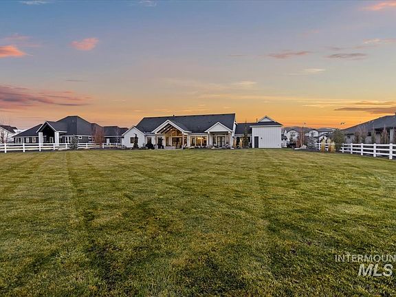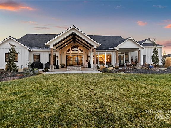 This Highland Homes masterpiece is the ultimate blend of luxury, space, and functionality, set on a prime north-facing acre in Dry Creek Ranch’s coveted Mirror Pond with unobstructed mountain views. The standout feature is the 2,422 sq. ft. heated garage, complete with a 55’ RV bay, full hookups (sewer, water, 50 amp), custom cabinets, epoxy flooring, and a 220V-powered workshop—a dream setup for RV enthusiasts, collectors, or hobbyists. Inside, 3,441 sq. ft. of thoughtfully designed living space includes 4 bedrooms, 3 bathrooms, a flex room, bonus room, and office. High-end finishes include a shiplap ceiling with wood beams, 16’ vaulted ceilings, Monogram appliances, quartz counters, and oversized 8’ sliding doors that seamlessly connect the indoors to the expansive extended back patio. Designed for entertaining and relaxation, the large covered patio offers a cathedral ceiling, ample seating space, and a stunning built-in gas fire pit, making it the perfect setting for year-round indoor-outdoor living.