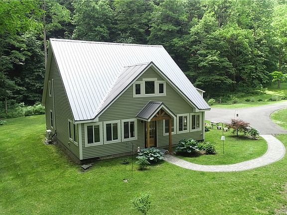 New Listing! Newer Contemporary Cape Cod Home tucked back on over 8 acres, nestled in along Naples Creek and bordering Grimes Glen Park. This lovely home has an open floorplan with Master bedroom and Laundry on first floor. Open loft bedroom on second floor, with full bath, is currently set up as sitting room. Enjoy the extra living space in the Sun room, plenty of windows to fill the home with natural light! Tongue and Groove Pine Cathedral Ceilings, and Gorgeous Scrapped Hickory Flooring are just some of the highlights of this home. Cook to your hearts content in the Bright and Cheery kitchen with solid wood cabinetry and nicely sized kitchen island. Enjoy entertaining on your covered side patio. Large private yard is beautifully landscaped. Oversized two car garage offers storage options. Walls are constructed of 6 1/2 in Structurally Insulated Panels for extreme energy efficiency. Mechanics of the home feature Radiant floor heat, a Split unit to provide A/C, Instantaneous hot water tank & High producing Well, Engineered Septic System. 2 story Carriage house would make a great studio! Delayed Negotiations until Wednesday June 28th at Noon