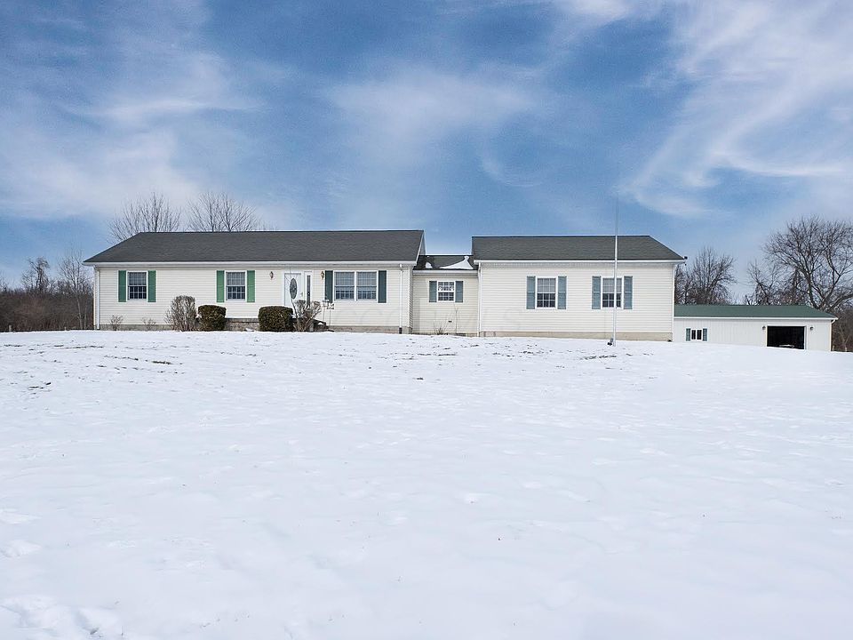 Welcome to this charming ranch home in the country, where nature meets comfortable living. This delightful three-bedroom, two bathroom dwelling sits on over 8 acres, and offers a peaceful setting for those seeking a serene lifestyle outside of town. This property is conveniently located 10 minutes from downtown Mount Vernon and just 45 minutes from Columbus. This home features a three-car attached garage and a 48' x 24' outbuilding which includes an insulated work shop and additional parking space. A beautiful back deck overlooks a spacious backyard and fire pit area, all fenced in. The walkout basement boasts additional living space and is plumbed for an additional bathroom.
