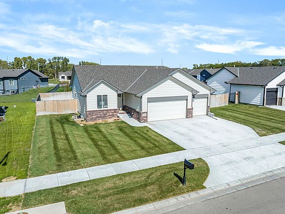 Located in the desirable Derby area, this stunning four bedroom, three bath home was brand new in 2022 and has exquisite finishes inside and out. Elegance begins at the curb, with a lush green lawn sustained by an irrigation well and sprinkler system, setting the stage for a grand entrance. Step inside to discover an inviting entry foyer with a convenient mudroom bench, providing space to kick off your shoes. The living room showcases vaulted ceilings and picture windows, while beautiful luxury vinyl flooring flows throughout the main living spaces. The kitchen is open to the living room, creating the ideal layout for entertaining. Bright and spacious, the kitchen offers ample cabinet space, granite counters, stylish tile backsplash, an eating bar island, and a spacious pantry for all your storage needs. Adjacent to the kitchen, the dining room sits in front of sliding doors that open to the backyard, offering lovely views while you enjoy your meals. The master bedroom, graced by a tray ceiling, offers an en suite bathroom with a luxurious shower and a double vanity. A second bedroom and another full bath complete the main floor. Downstairs, the family room provides ample space for a theater area and even a ping pong or pool table, if desired. Two additional bedrooms and a third full bath give you plenty of room to spread out. Outside, the fully-fenced back yard has a patio and tons of room for outdoor activities and adventures. This home combines a sense of privacy with convenient proximity to local schools, parks, shopping, restaurants, and quick highway access via K-15. Don't wait! Schedule your private showing today and seize the opportunity to make this beautiful home yours before it's gone!