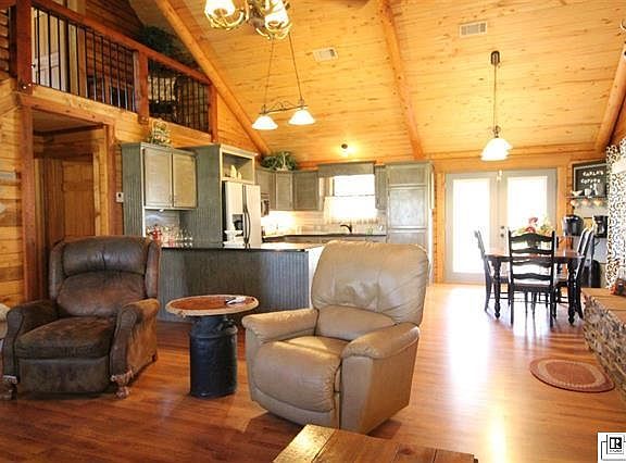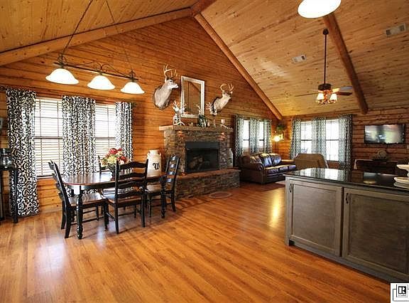 Come check out this secluded log cabin home on 12 acres with a wrap around porch and watch the deer from your spacious, covered back deck. Beautiful aspen wood ceilings, rustic barn style doors, tin accents, granite, gas log fireplace, jet tub, walk-in closets, over -sized utility room with separate outside entrance! Property also includes two ponds, workshop with electricity, boat shed, double carport, water well for pasture/outbuildings and two additional home sites with power, water and sewer. Fenced for livestock. Contact a Realtor today for your appointment.