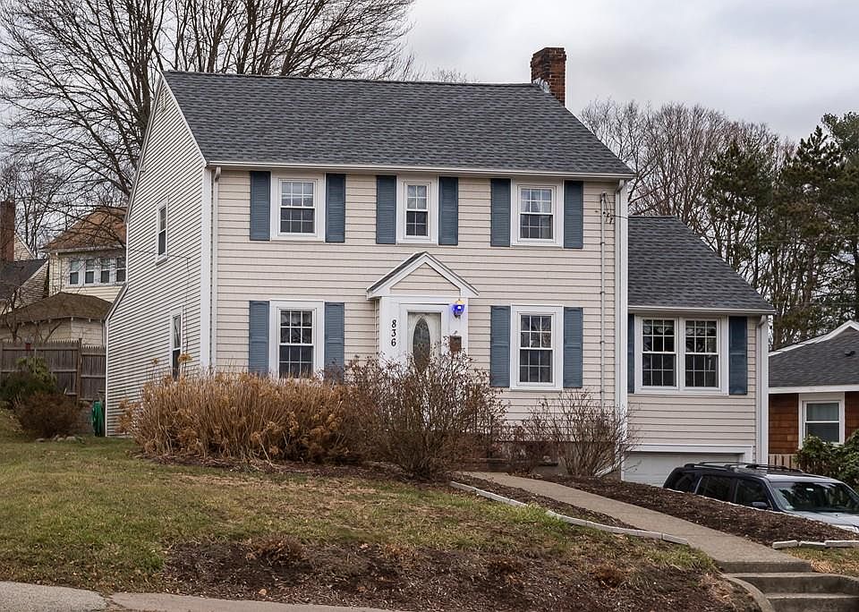 This light, bright Weymouth colonial is convenient to everything! Featuring freshly refinished hardwood flooring and a brand new roof. Front entrance opens to a front to back living room with wood burning fireplace on the right and formal dining room with built in cabinetry on the left. Dining room leads to bright, modern kitchen featuring skylights, stainless appliances and kitchen island. Additional living space in the family room, featuring cathedral ceiling, exposed brick and exposed beams. Second floor includes master bedroom and two additional bedrooms, all featuring hardwood floors and ceiling fans. Full bathroom completes this level. Bonus room in partially finished basement with access to one car garage. Rear of the home features wood deck overlooking partially fenced yard. Fire pit awaits the next round of s'mores. Public transportation, shopping, and Legion field, with walking track, tennis courts and turf fields, are moments away. Welcome home!
