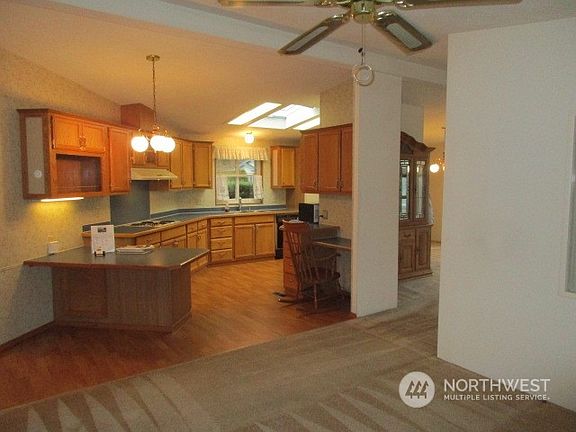 Larger, 1568 Sq. Ft. 2- bedroom Manufactured home with an extra room. Good View of Mount Rainier from the spacious Living Room. Den has a pellet stove to keep you warm. Primary bedroom has a big walk-in closet, Primary bathroom has lots of counter space and a large shower. Secondary bathroom is conveniently located next to a large laundry room. Washer & Dryer stays with the home. This home has a spacious kitchen, with lots of counter space, and all appliances stay. Beautiful wood grained laminate flooring in many rooms. Roof and skylights are in good condition. The heat Pump is new, furnace is in good condition. The home has a large shop, and the home is wired for a generator that goes with home.