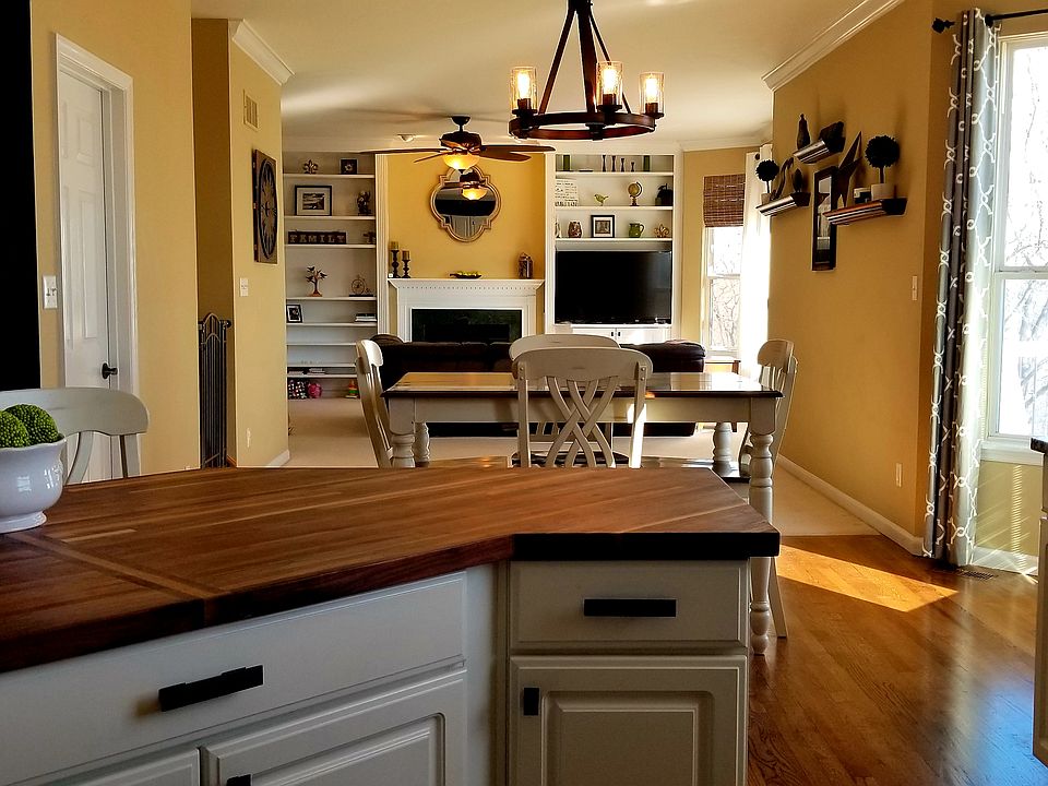 - Kitchen: Breakfast Bar, Center Island, Custom Cabinetry, SolidSurfaceCounter, Eat-In Kitchen, Pantry, Breakfast Room, Walk-In Pantry