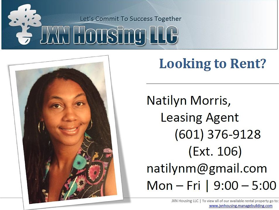 This is an AS IS lease, but if you need a big house for a bargain - you've found it! How to lease a house from JXN Housing: JXN Housing (found on the web at www.jxnhousing.managebuilding.com) is a MS Licensed Real Estate Brokerage and Property Management Company. We lease property all over town, and in all price ranges. If you would like to lease a house from us please: 1. Browse the entire website, and look at all of our available units. 2. Schedule an appointment to view the house you want by either using our nifty scheduling feature on the website, or simply calling our office at 601-376-9128 and speak to the one of the leasing agents (or a staff person) at extension 2. (If you'd like to speak with a specific leasing agent simply call us 601-376-9128, and press extension 106 to speak to Natilyn!) 3. Once you've found the house you want, or if you already know which one you want - file an application on our website (or by copying and pasting this link into your browser 4. Complete the application by answering the questions sent to you from TransUnion Smartmove, and send your pay stubs to the office manager at support @ jxnhousing . com or via fax at 601-510-9564. 5. Finally, once you find out if you are approved call the office (601-376-9128 extension 2) and schedule a time to come in. You will need to either bring in your deposit which will hold the house for you, or bring your deposit and first month's rent into the office - and you can move in. Should you have any questions, please call our office (601-376-9128 extension 2). Our office is locate in Belhaven, around the corner from McDade's Market, and our regular office hours are 9:00 AM to 5:00 PM.